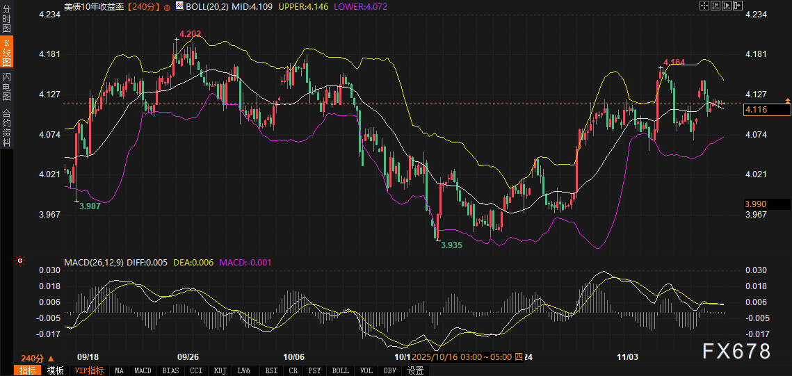 技术层面,美债、美元和黄金的240分钟图表显示出关门尾声的印记,基本面驱动正逐步嵌入价格路径。10年期美债收益率当前报4.116%,日内小幅回落,但布林带(BB 20,2)中轨位于4.109%,上轨4.146%、下轨4.072%,显示价格在中上轨区间震荡,MACD(26,12,9)DIFF为0.005、DEA为0.006,正值虽窄小,却暗示动能偏向上行。这反映了重开预期下的风险偏好修复:关门期间收益率曾因流动性担忧而下探下轨,重开信号已推动其回测中轨,融合了财政支出重启的供给压力。技术派观点认为,此区间内,美债收益率的突破将直接锚定美元路径——上轨失守或确认再通胀定价,下轨则暴露数据疲软风险。