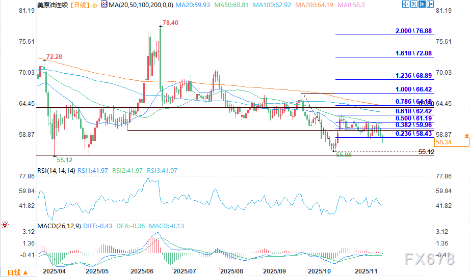 汇通财经APP讯——周五(11月21日)欧洲时段,看空情绪主导市场,注意力转向下一主要下行目标:10月20日形成的55.96美元主要底部,以及5月5日的55.30美元主要底部。
