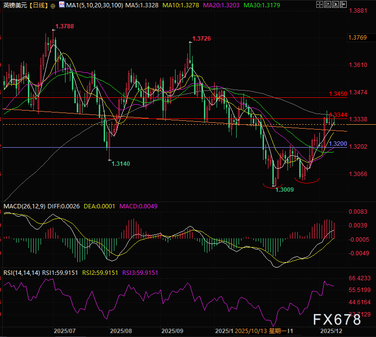 汇通财经APP讯——周二(12月9日)英镑兑美元(GBP/USD)走出冲高回路走势,之前汇价在抵达量度涨幅后在1.3300关口上方维持窄幅震荡,近期连续测试1.3344关键价位并无法通过,目前交投于1.3322附近,市场聚焦本周美联储与英国央行的政策线索,多空因素交织下交易员普遍持币观望,短期汇率缺乏明确方向性动能。