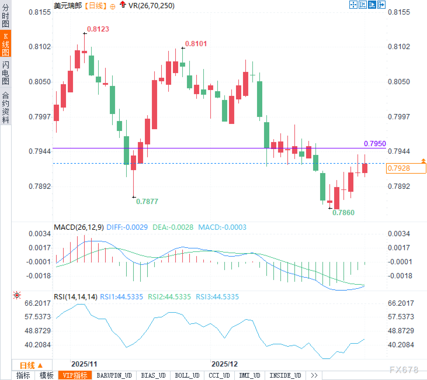 美元兑瑞郎的价格行为与年末以来的节奏高度一致:先在0.7860附近出现阶段性止跌,再回到0.79上方整理。当前0.7930所处位置,介于前期反弹后的整理区间之内,而上方0.7950一带也容易成为技术交易者关注的参考区。若从动量指标观察,日线图上MACD仍处于零轴下方,柱状动能接近收敛,意味着下行趋势的惯性在减弱,但并未完全扭转;RSI约在44附近,说明市场并未进入明显超卖的极端状态,更符合“弱势反弹后横盘修复”的典型形态。